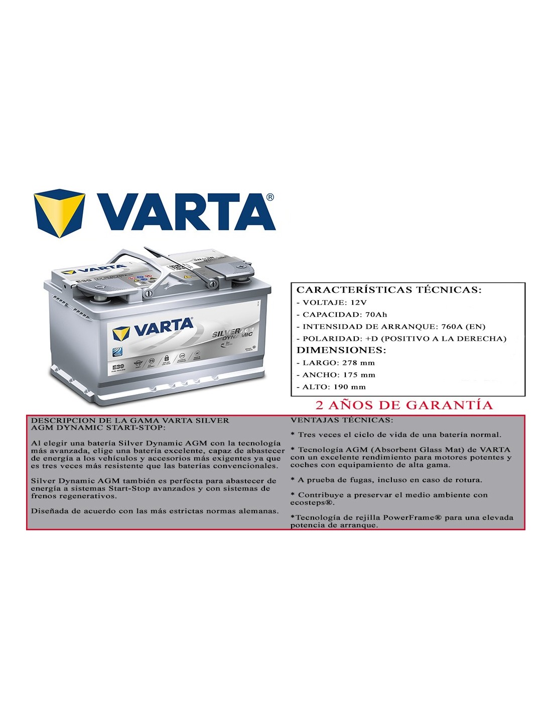 BATERIA COCHE VARTA 70AH 12V 760A (EN) SILVER DYMAMIC AGM DIMENSIONES 278 x 175 x 190 mm POSITIVO BORNE DERECHO 2 AÑOS GARANTIA