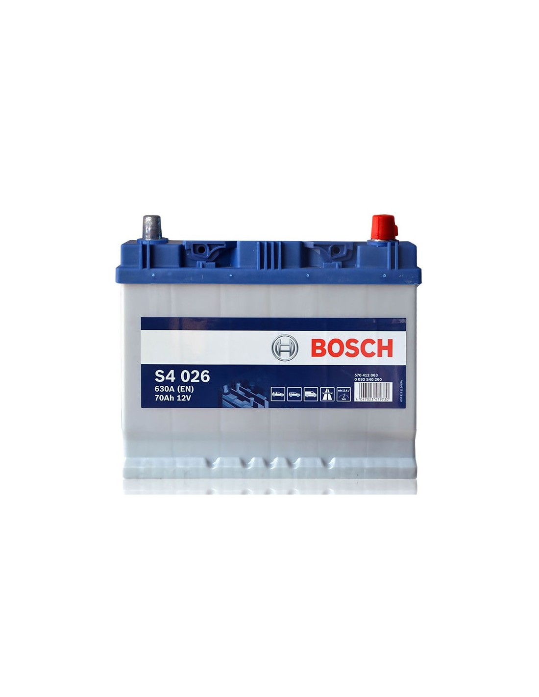BATERIA BOSCH 70AH 12V 630A (EN) GAMA S4 DIMENSIONES 261 x 175 x 220 mm S4026 POSITIVO EN BORNE DERECHO 2 AÑOS GARANTIA