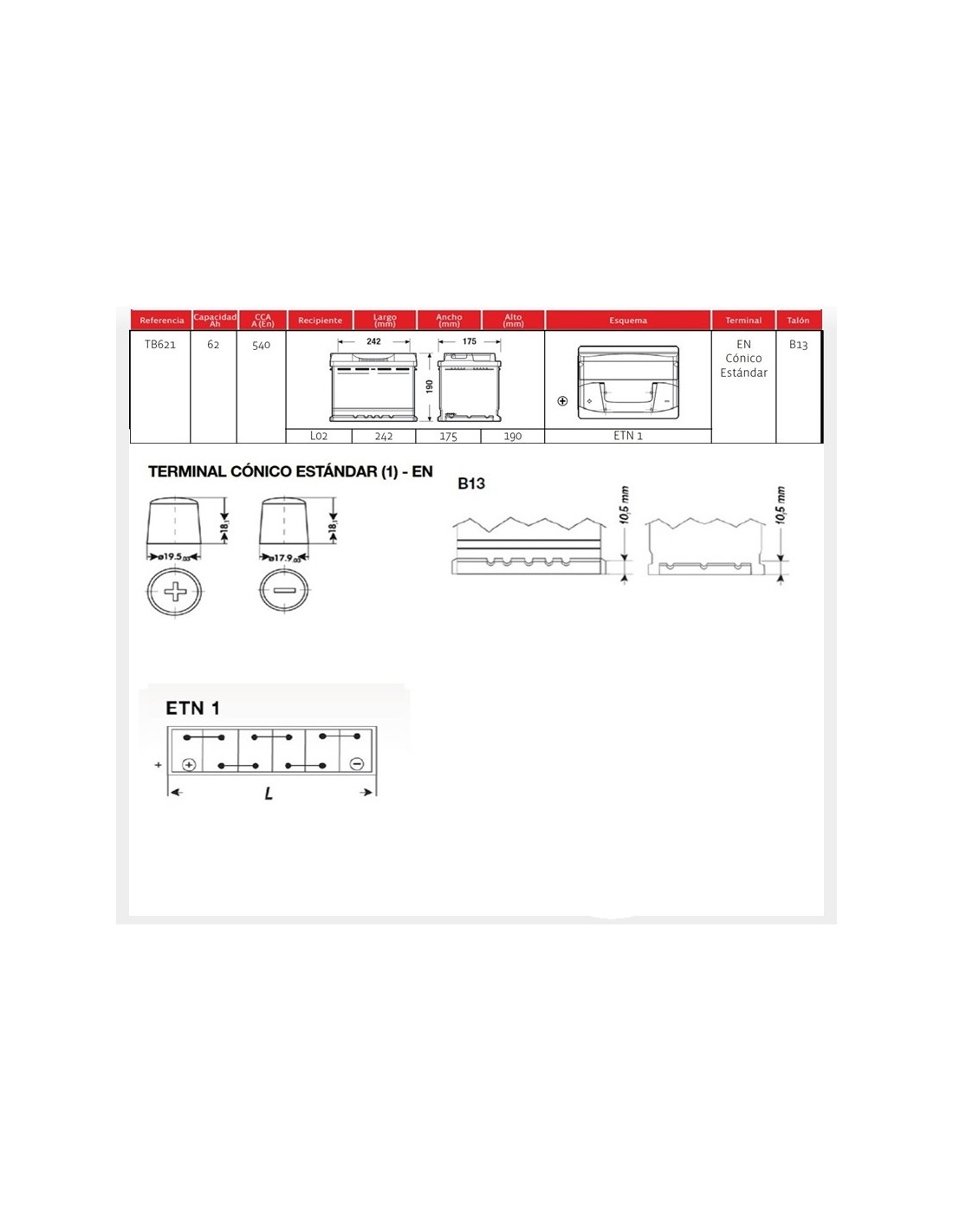 BATERIA COCHE EXIDE 62AH 12V 540A (EN) GAMA EXCELL DIMENSIONES 242 x 175 x 190 mm POSITIVO EN BORNE IZQUIERDO 2 AÑOS GARANTIA