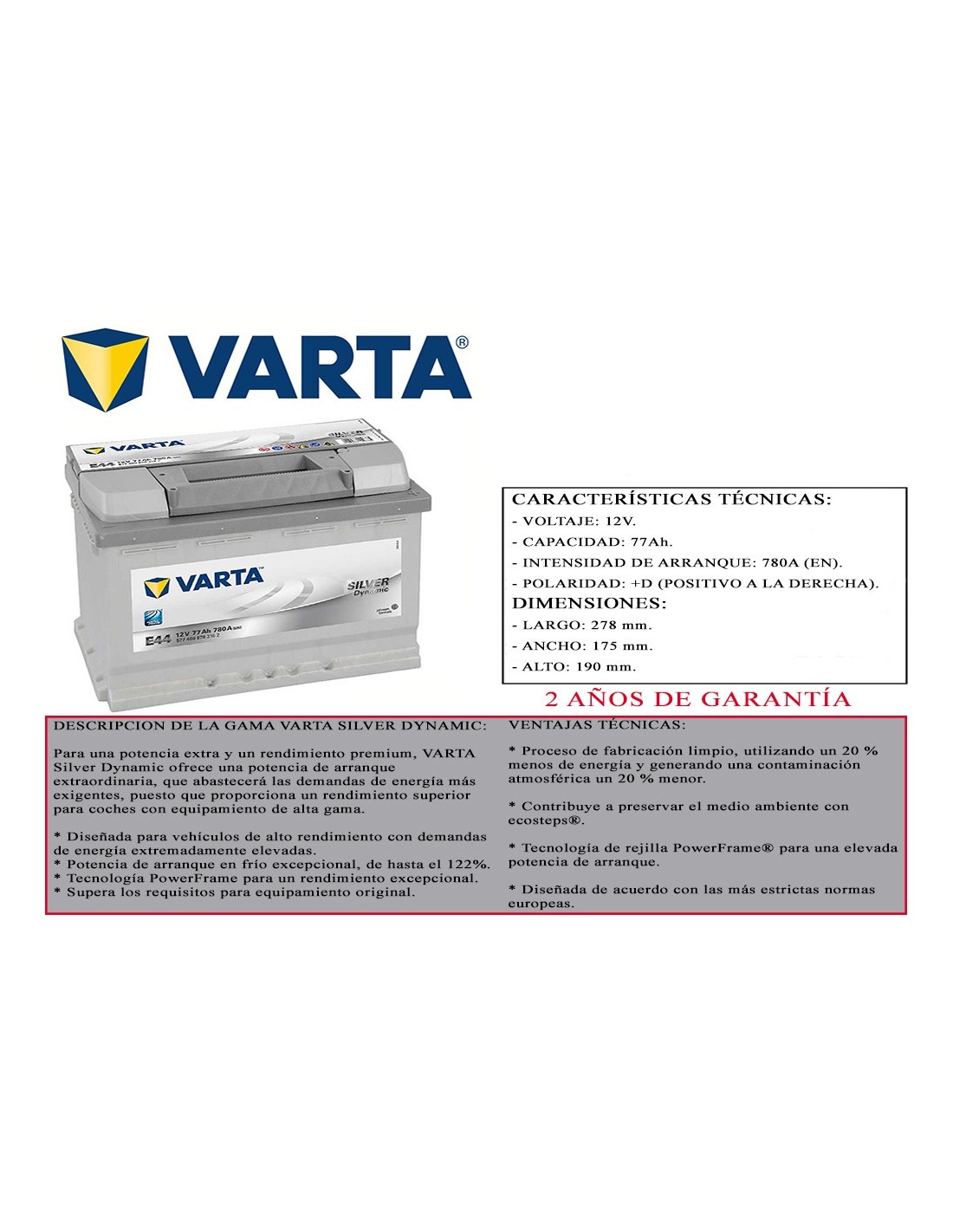 BATERIA COCHE VARTA 77AH 12V 780A (EN) GAMA SILVER DYMAMIC DIMENSIONES 278 x 175 x 190 mm POSITIVO BORNE DERECHO 2 AÑOS GARANTIA