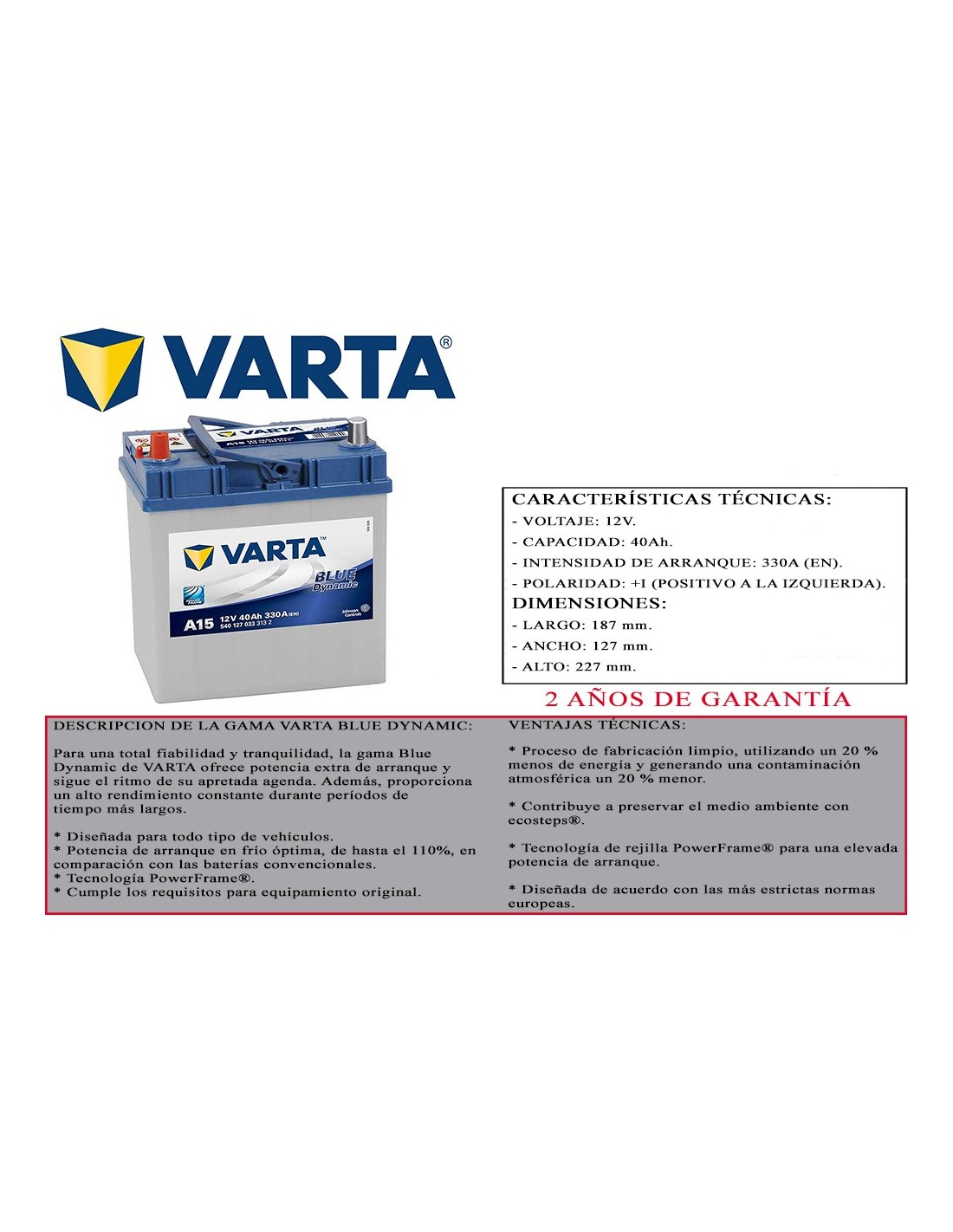 BATERIA COCHE VARTA 40AH 12V 330A (EN) GAMA BLUE DYMAMIC DIMENSIONES 187 x 127 x 227 mm POSITIVO BORNE IZQUIERDO 2 AÑOS GARANTIA