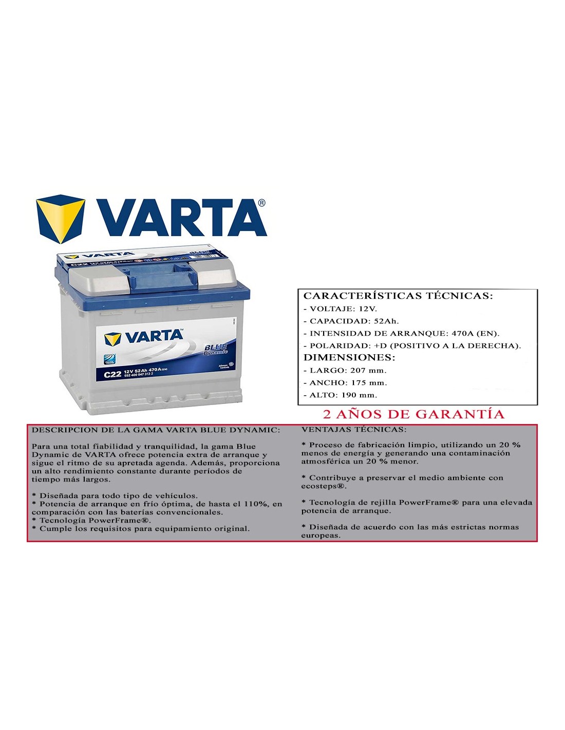 BATERIA COCHE VARTA 52AH 12V 470A (EN) GAMA BLUE DYMAMIC DIMENSIONES 207 x 175 x 190 mm POSITIVO BORNE DERECHO 2 AÑOS GARANTIA