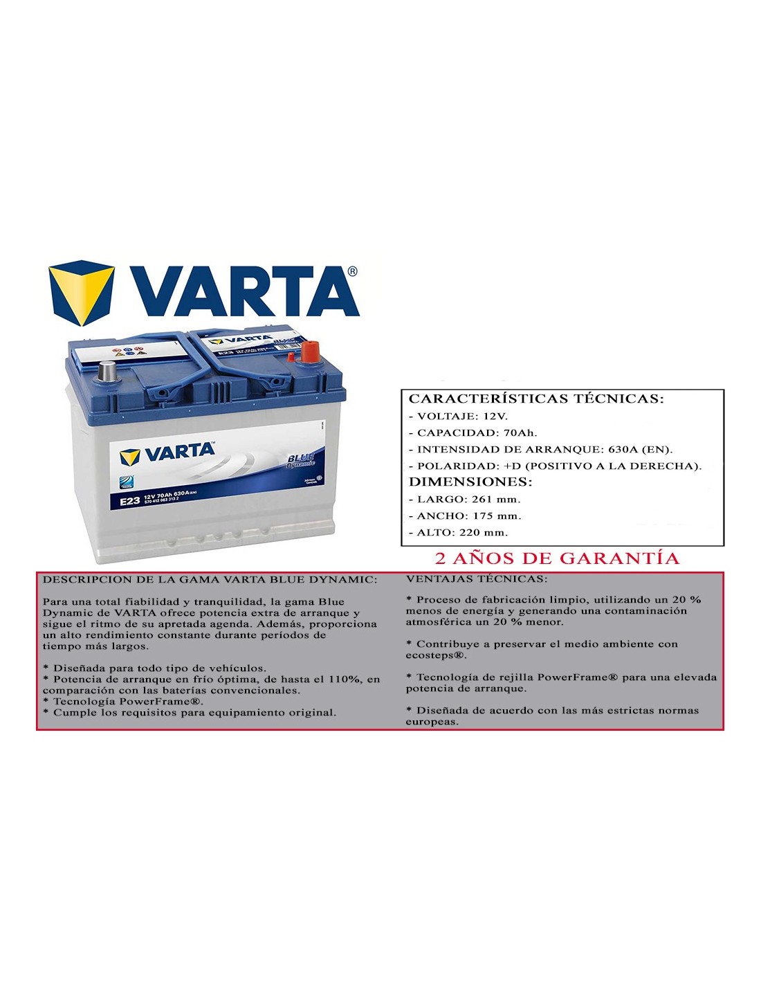 BATERIA COCHE VARTA 70AH 12V 630A (EN) GAMA BLUE DYMAMIC DIMENSIONES 261 x 175 x 220 mm POSITIVO BORNE DERECHO 2 AÑOS GARANTIA