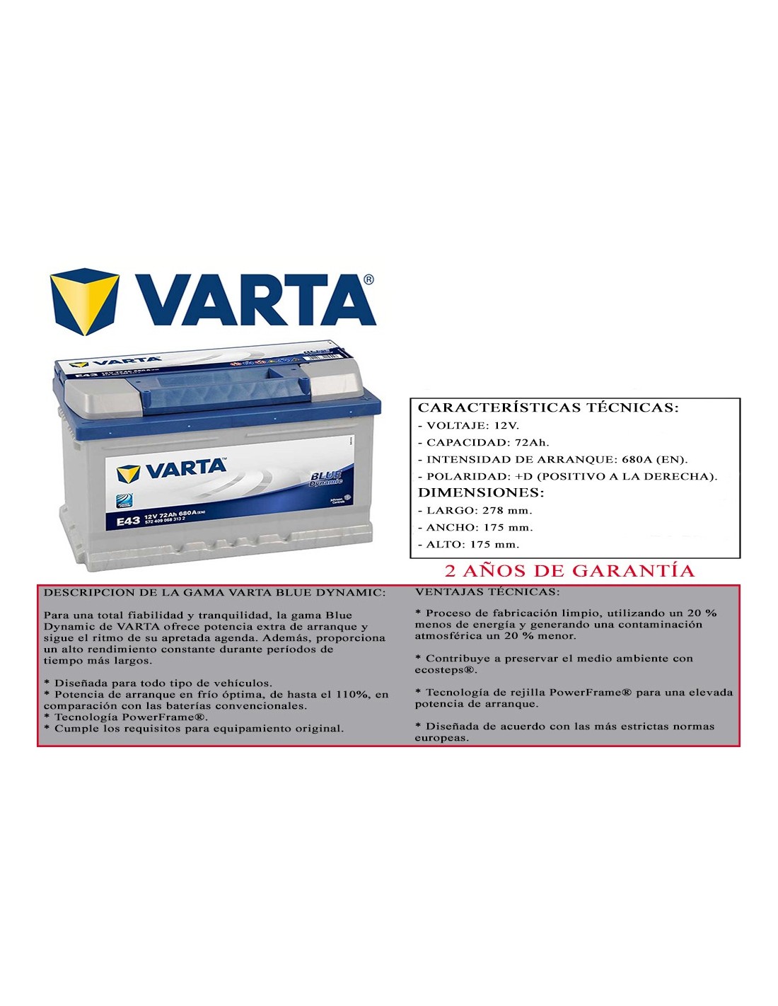 BATERIA COCHE VARTA 72AH 12V 680A (EN) GAMA BLUE DYMAMIC DIMENSIONES 278 x 175 x 175 mm POSITIVO BORNE DERECHO 2 AÑOS GARANTIA