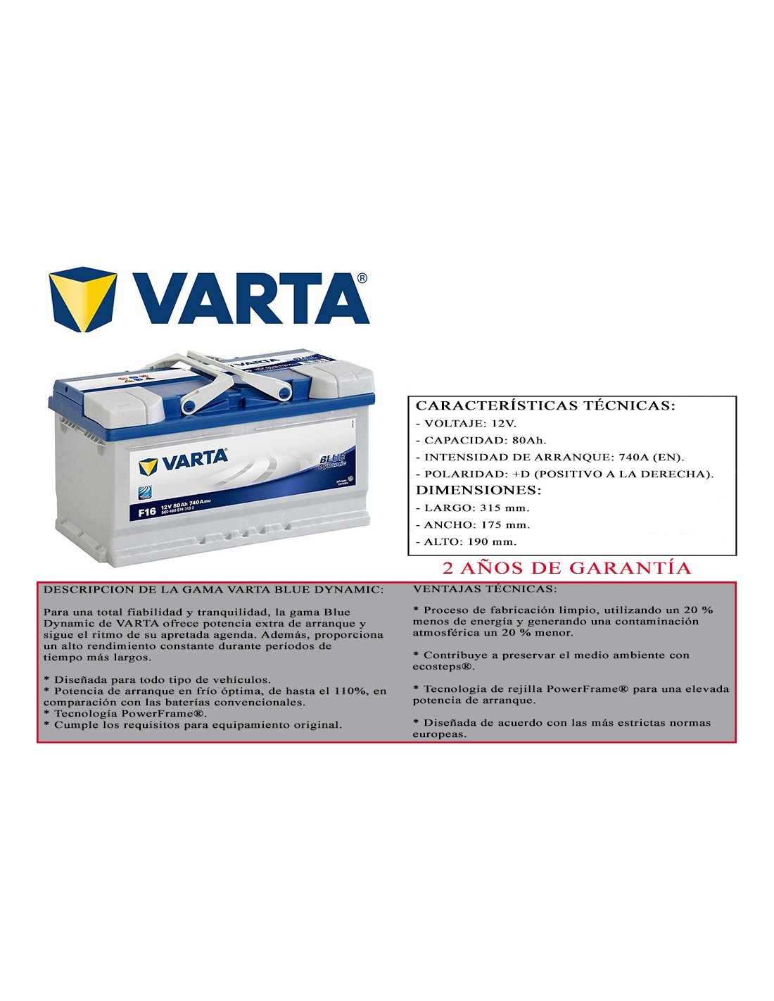 BATERIA COCHE VARTA 80AH 12V 740A (EN) GAMA BLUE DYMAMIC DIMENSIONES 315 x 175 x 190 mm POSITIVO BORNE DERECHO 2 AÑOS GARANTIA