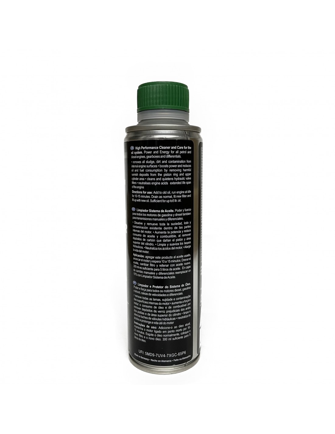 APLICACIÓN: agregar este producto al aceite usado, arrancar el motor y espera 10-15 minutos. Vaciar el aceite del motor, cambiar filtro de aceite y echar aceite nuevo. 300ml es suficiente para 5 litros de aceite. En cajas de cambio manuales o diferenciales, reemplazar un 10% con Limpiador de Sistema de Aceite.